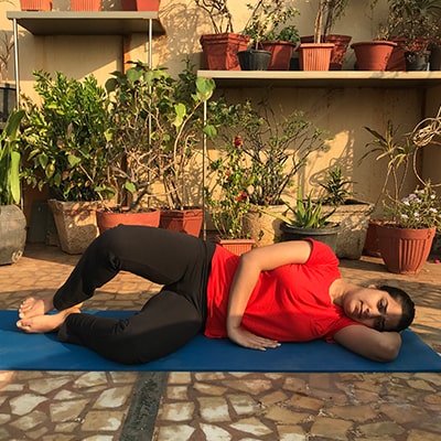 Starting position: Lie on your left side with your hip and knees bent approx 90°, and the feet together.